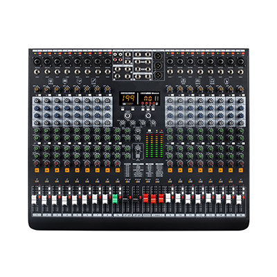 配置: 输入(16ch) 10路Mic/ Line( XLR母插头和¼" TRS组合输入接口 ), 3路立体声线路输入,1路USB Media( U盘播音或蓝牙音频 )和CD立体声; 输出(12ch) 1路Main L/ R、4路编组、5路AUX,1路立体声监听。 ( 均为XLR公插头接口,差分平衡输出 )